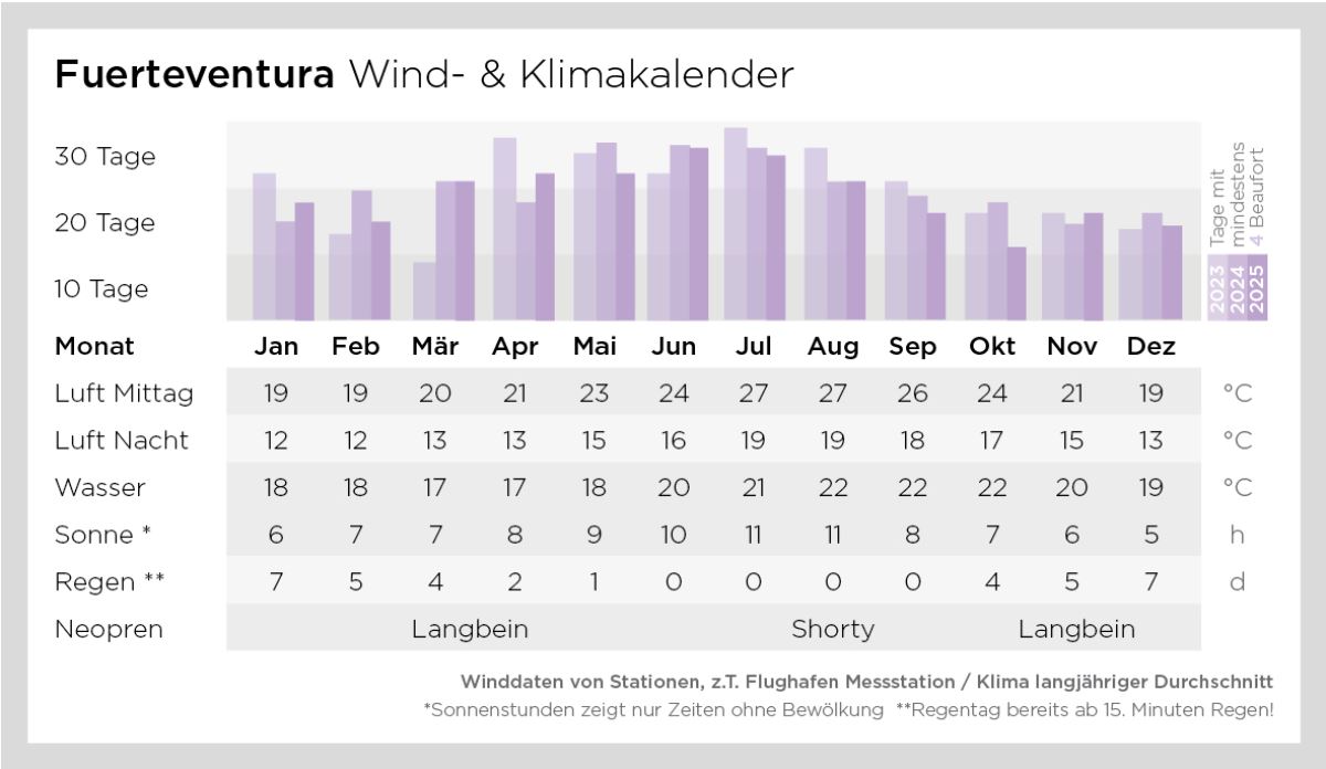 Die Insel Fuerteventura bietet ganzjährig ein sehr angenehmes Klima. Im Winter liegen die Tagestemperaturen bei durchschnittlich 20°C und im Sommer bei ca. 28°C. Die Wassertemperaturen bewegen sich zwischen 18°C und 23°C. Auch im Sommer empfehlen wir Euch für die Abendstunden eine Jacke einzupacken, da die Temperaturen hier oft merklich abkühlen. Für das einzigartige Klima verantwortlich sind die gleichbleibende Meeresströmung, der Kanarenstrom und der stetige Nordost – Passatwind. Besonders in der „Sotavento Düse“ entstehen außergewöhnliche Bedingungen: Der Wind wird zwischen zwei Bergzügen beschleunigt. Gleichzeitig steigt die von der Sonne aufgeheizte Luft der Insel nach oben und komprimiert den kühleren Passatwind. Wenn der Wind dann wieder aufs Meer trifft, löst sich die Kompression und der Wind erfährt eine erneute Beschleunigung. Der Wind baut sich am Morgen langsam auf und erreicht gegen Mittag seine volle Stärke. In Sotavento und in Risco del Paso liegt der Wind bei ca. 7-8 Bft, in Matas Blancas ca. 1 Bft schwächer. Je stärker der Wind, desto böiger wird er.